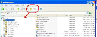 Okay, what else do we have here. Under Desktop is My Documents. See the little plus sign next to it. Squint! Ah, there it is– circled in red. This plus sign lets us Expand the folders. So, if you click it, the folders that are inside the My Documents folder will expand. You won’t see any files on the left– only folders (and drives, which are like giant folders.) Click the expand button.